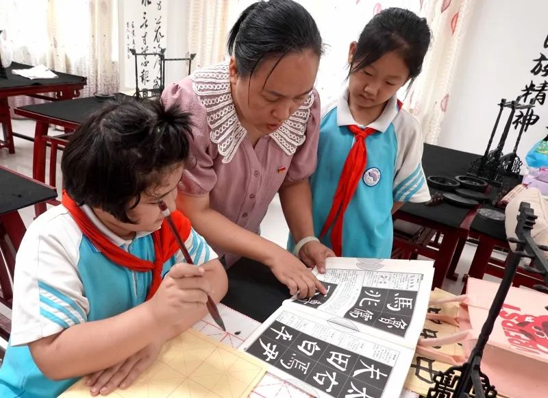 9月11日,若羌县第一小学的学生在书法老师的指导下,练习写毛笔字。记者邹焰忠摄