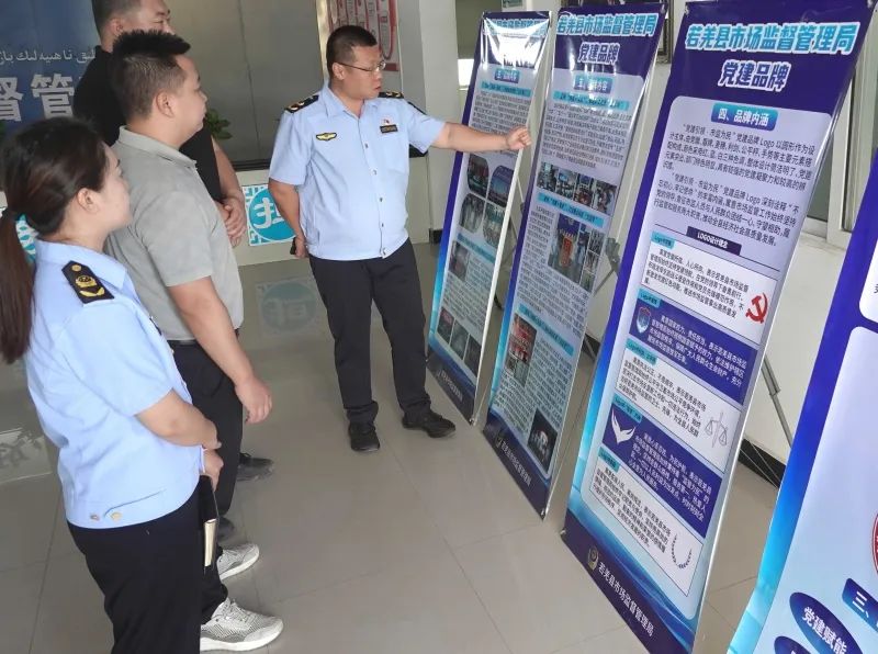 县市场监督管理局在特色党建品牌创建中,打造出了“党建引领·市监为民”特色党建品牌,与市场主体一起提炼出了“用党建‘红’照亮市场‘蓝’”logo。
