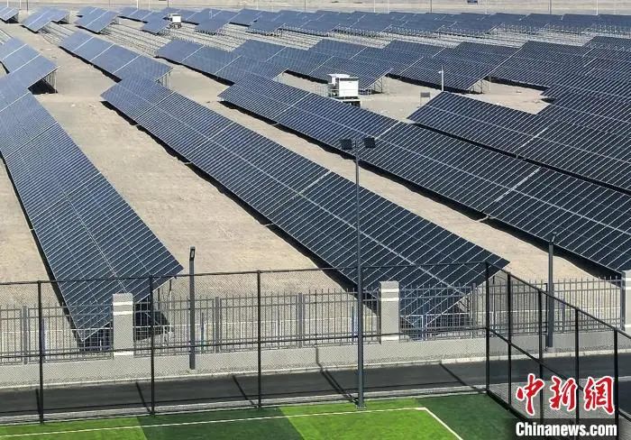 在中国绿发新疆中绿电若羌400万千瓦光伏项目现场,一列列光伏板有序铺展开。中新社记者陈舒一摄