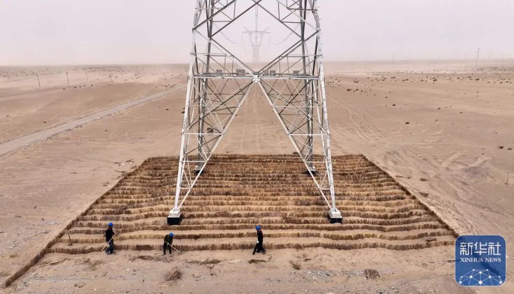 ↑新疆和田地区于田县,施工人员在线路塔基下铺设草方格(4月24日摄)。新华社发(马元摄)