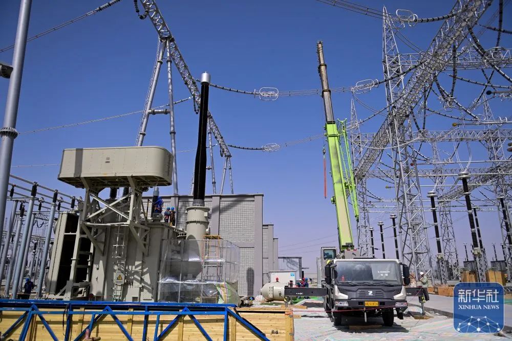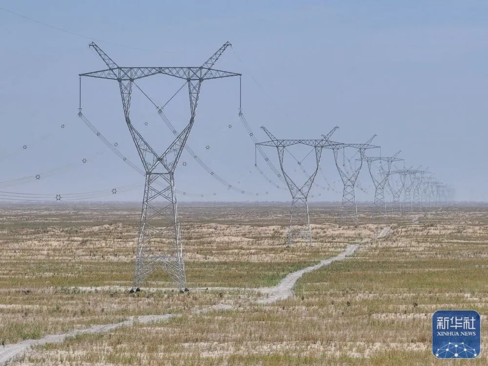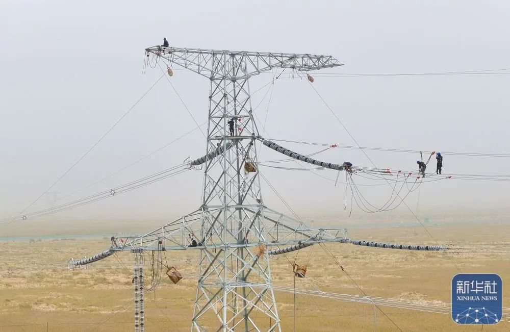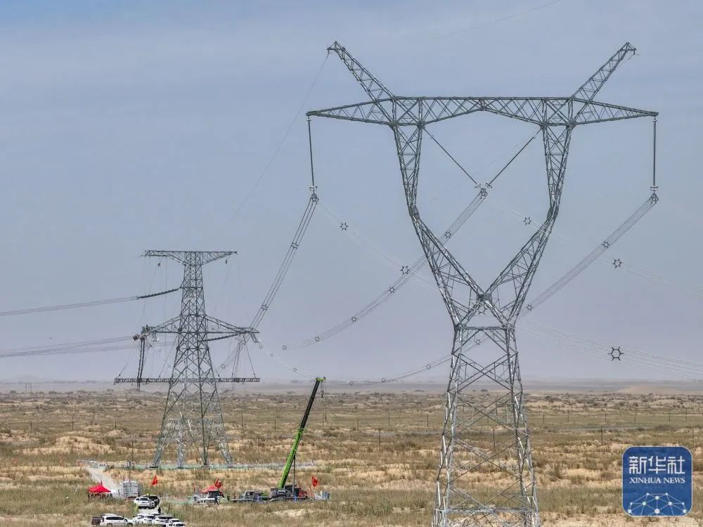 ↑这是建设中的巴州-铁干里克-若羌750千伏输变电工程(2024年8月13日摄)。新华社发(马元摄)