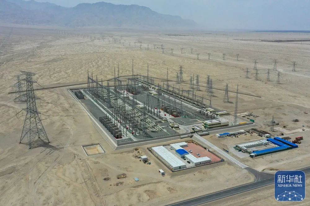 ↑这是已经投运的新疆环塔里木盆地750千伏输变电工程若羌750千伏变电站(6月27日摄)。新华社记者丁磊摄