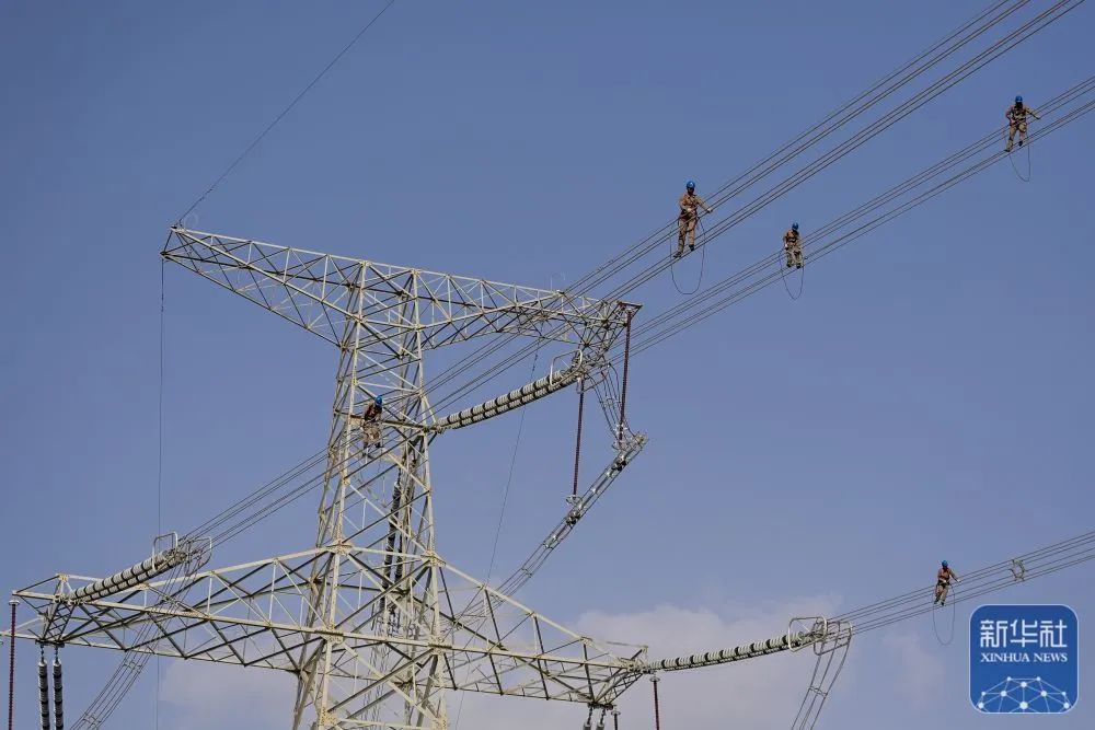 ↑在民丰-且末750千伏线路,作业人员进行导线架设工作(7月11日摄)。新华社发(张利民摄)