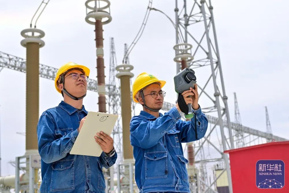 ↑在新疆环塔里木盆地750千伏输变电工程若羌750千伏变电站,运检人员检测设备温度(6月27日摄)。新华社记者丁磊摄