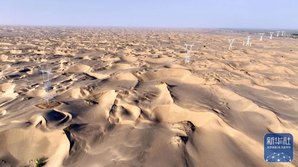↑新疆环塔里木盆地750千伏输电线路穿越“死亡之海”塔克拉玛干沙漠(6月25日摄)。新华社发(马元摄)