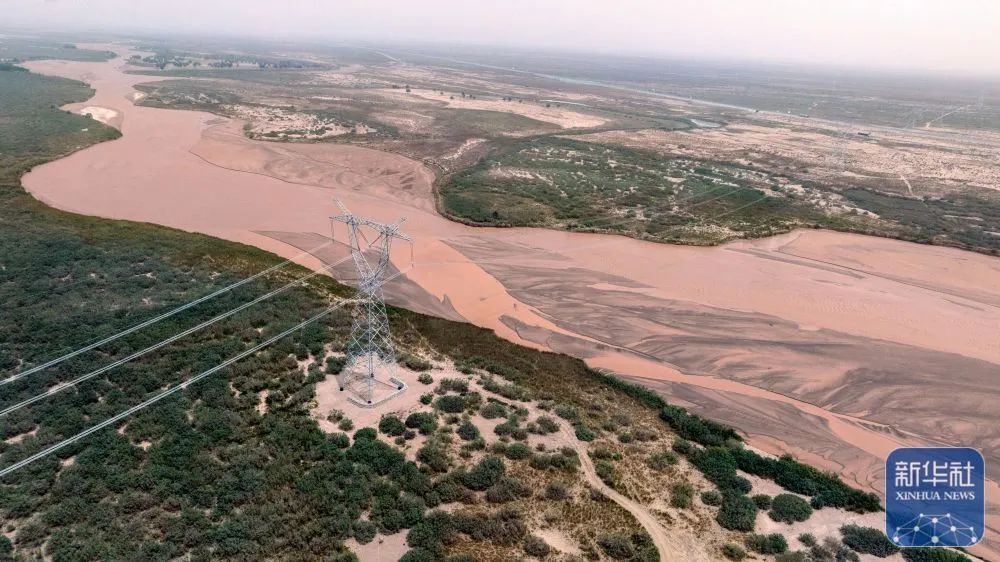↑新疆环塔里木盆地750千伏输电线路跨越车尔臣河(6月14日摄)。新华社发(马元摄)