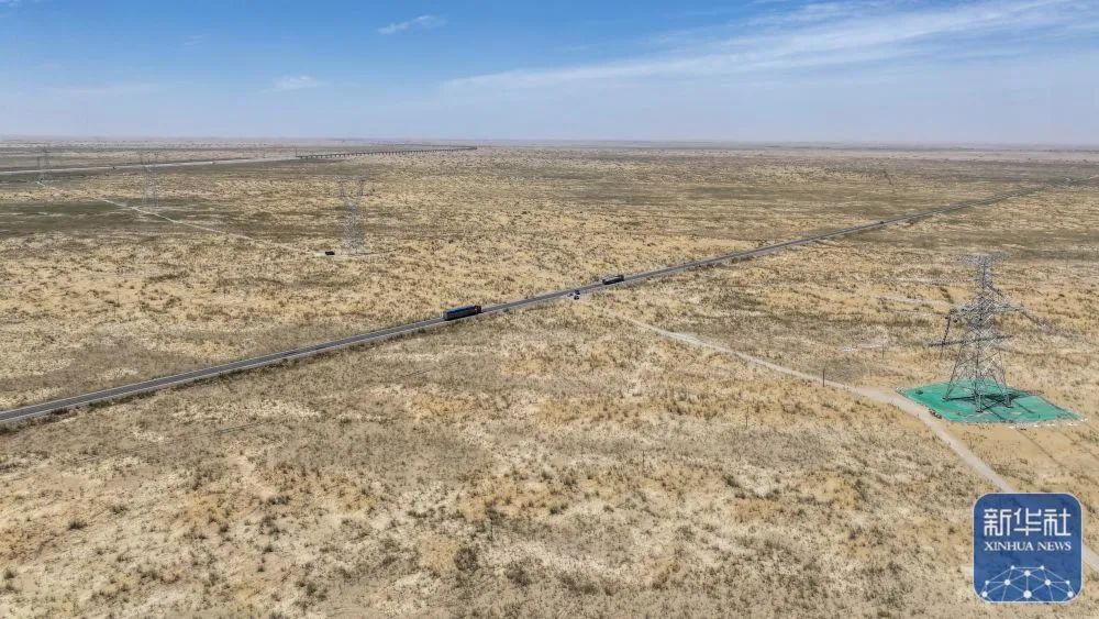 ↑这是且末-若羌750千伏输变电工程(5月22日摄,无人机照片)。新华社发(马元摄)