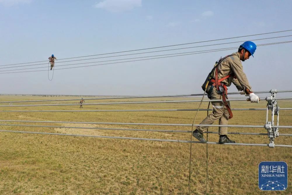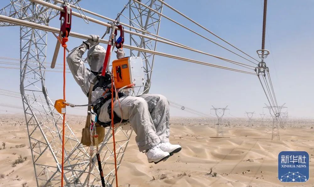↑施工人员在且末-若羌750千伏线路开展走线消缺工作(6月24日摄)。新华社记者丁磊摄