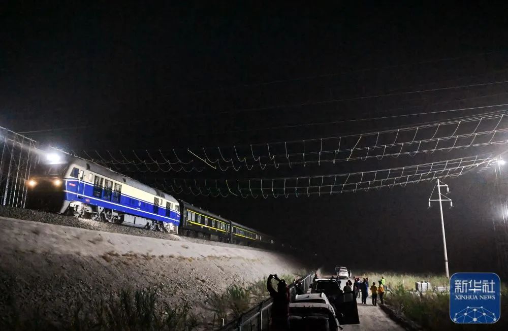 ↑在位于新疆民丰县境内的和田-民丰-且末-若羌750千伏输变电工程跨越和若铁路作业现场,一列客车从跨越网下驶过(7月10日摄)。新华社发(马元摄)