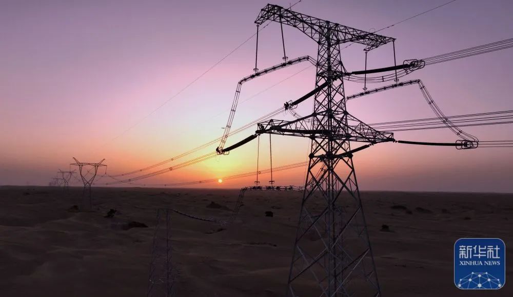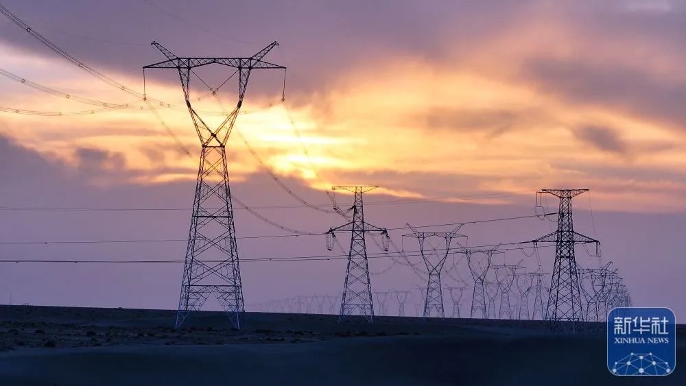 ↑这是晨曦中的和田-民丰-且末-若羌750千伏输变电工程(3月23日摄)。新华社发(马元摄)