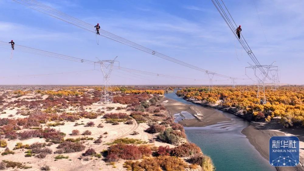 ↑在巴州-铁干里克-若羌750千伏输变电工程现场,作业人员开展走线消缺作业(2024年10月16日摄,无人机照片)。新华社发(马元摄)