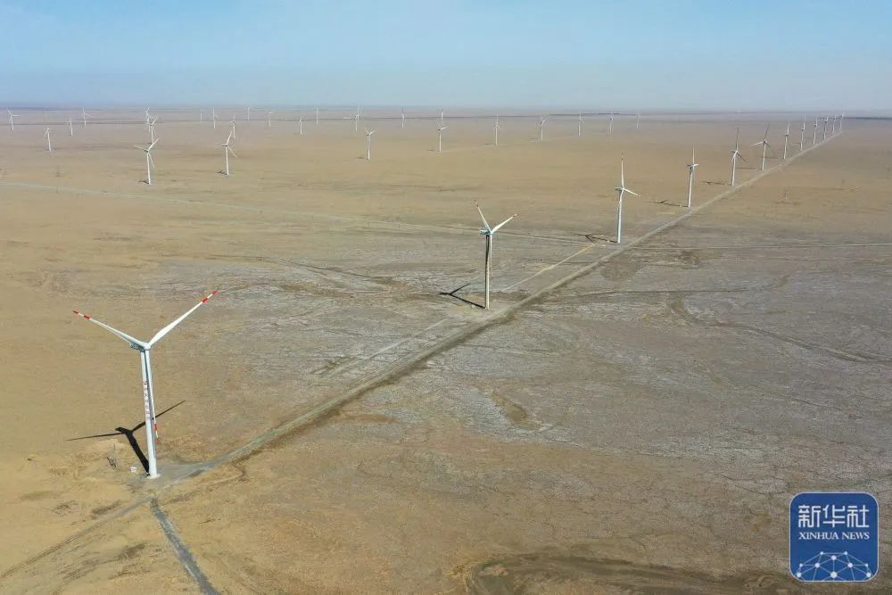 ↑这是在新疆巴音郭楞蒙古自治州若羌县拍摄的新天绿色能源股份有限公司新天若羌县罗布庄10万千瓦风电项目(6月27日摄,无人机照片)。新华社记者丁磊摄