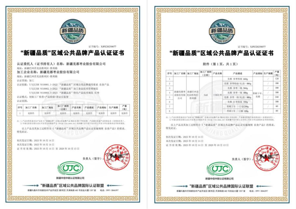 近日,新疆羌都枣业股份有限公司生产的干制红枣产品顺利通过严格审核,荣获“新疆品质”区域公共品牌产品认证证书。这一认证标志着羌都枣业在产品品质、生产技术、管理体系等方面达到了“新疆品质”的高标准要求,也是对巴音郭楞蒙古自治州(简称巴州)特色林果产品卓越质量与市场竞争力的高度认可。
