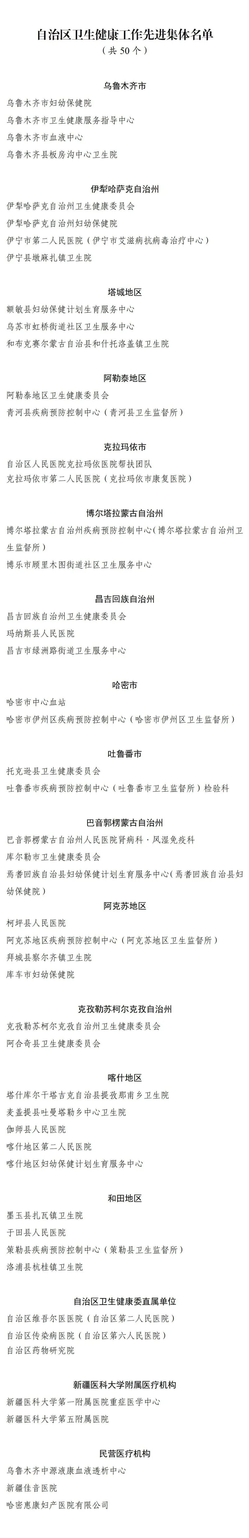 10月22日,记者从自治区卫生健康委获悉,为发挥先进典型示范引领作用,激励全区卫生健康系统广大干部职工奋发有为,经自治区党委和政府批准,决定授予乌鲁木齐市妇幼保健院等50个单位“自治区卫生健康工作先进集体”称号,授予孙高峰等100名同志“自治区卫生健康工作先进个人”称号。