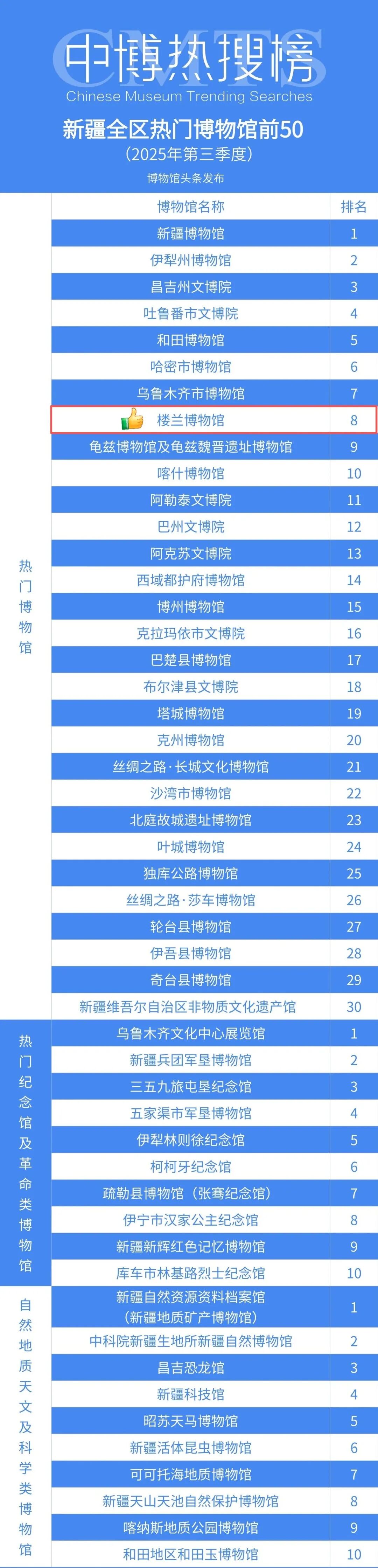 与此同期,由博物馆头条发布,2025年第三季度新疆地区热门博物馆前50榜单发布,50家受到网友高频搜索的博物馆上榜。若羌县楼兰博物馆排名新疆地区热门博物馆榜单第八,县级博物馆第一。