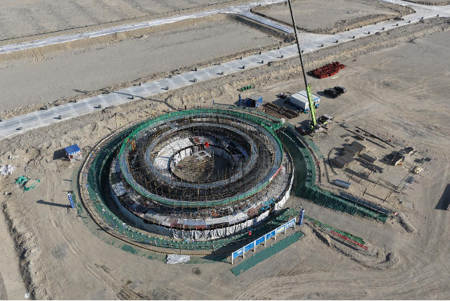 如今,在4平方公里的戈壁滩上,15.7公里道路顺利修通,167.35万方场地平整到位,4.2万方混凝土浇筑完成,13.5公里厂区临时用电线路架通,5.4公里厂区管道敷设就绪,5.5公里围墙拔地而起,主厂房全面开工建设,烟囱基础完成开挖……近百台挖掘机、渣土车、起重机等各类机械作业繁忙、机器轰鸣,超千名建设人员穿梭其中,现场如火如荼。