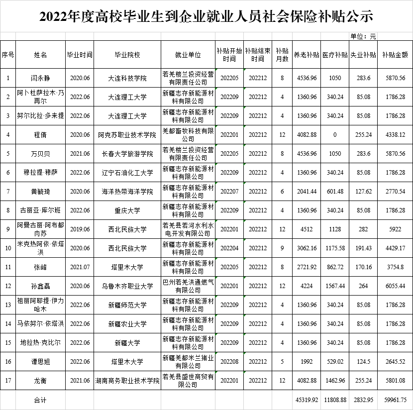 根据《新疆维吾尔自治区社会保险补贴办法》(新人社规〔2020〕1号)要求,高校毕业生到各类企业就业,按照企业为其缴纳的社会保险基数,其个人应缴纳的基本养老保险、基本医疗保险和失业保险费部分,给予全额补贴。经县域企业申报,县人社局会议研究,17名高校毕业生符合补贴享受条件,审定补贴金额6万元。现将进行公示。