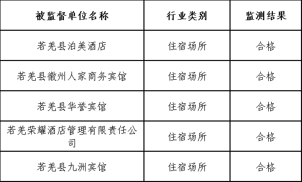 住宿场所共抽检5家,抽检项目为:1.设置卫生管理人员情况;2.建立卫生管理档案情况;3.从业人员健康体检情况;4.设置禁止吸烟标识情况;5.公示卫生许可证、卫生信誉度等级;6.按照规定落实公共用品用具消毒制度情况;7.床上卧具、毛巾、浴巾、茶杯、口杯的大肠菌群。