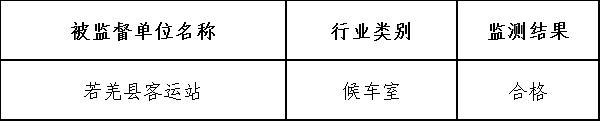 候车室共抽检1家,抽检项目为:1.设置卫生管理人员情况;2.建立卫生管理档案情况;3.从业人员健康体检情况;4.设置禁止吸烟标识情况;5.公示卫生许可证、卫生信誉度等级;6.按照规定落实公共用品用具消毒制度情况;7.噪音、一氧化碳、甲醛、臭氧。
