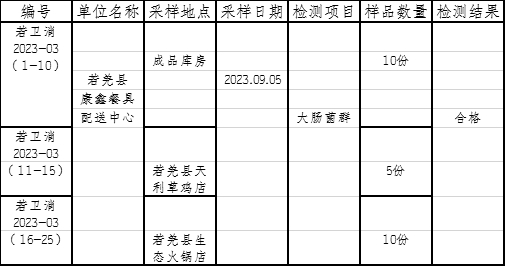 中秋节、十·一国庆节即将来临,为确保广大消费者餐桌上的食品安全,2023年9月5日,县卫生计生综合监督执法局联合县疾病预防控制中心对若羌县康鑫餐饮具配送中心开展专项检查并进行消毒效果检测,共采集样品25份,检测结果均为合格,检测结果公示和现场检查图片后附。