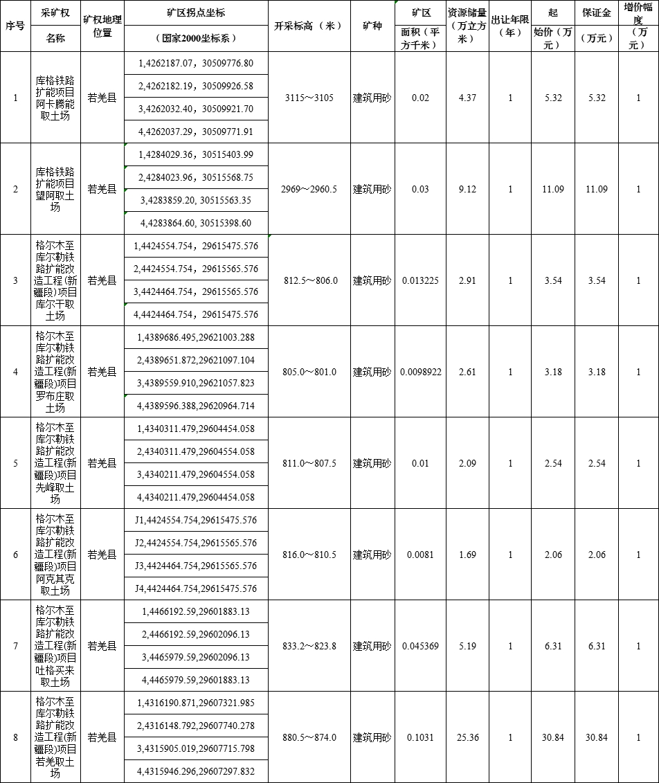 根据《中华人民共和国矿产资源法》、《矿产资源勘查区块登记管理办法》、《自然资源部关于印发矿业权出让交易规则的通知》(自然资规〔2023〕1号)、《新疆维吾尔自治区矿产资源管理若干事项暂行办法》(新自然资规〔2021〕1号)和《关于规范政务服务和公共资源交易中心收费项目和标准的通知》(新发改服价〔2020〕578号)等有关法律法规和政策规定,巴州政务服务和公共资源交易中心受若羌县自然资源局委托,对库格铁路扩能项目阿卡腾能取土场等8个采矿权以挂牌方式公开出让,现将有关事项公告如下:
