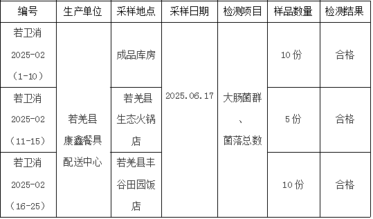 2025年6月17日,县疾病预防控制中心(卫生监督所)对我县康鑫集中餐具配送中心配送的餐饮具消毒效果进行消毒效果检测,共采集样品25份,检查结果均为合格,检测结果附后。
