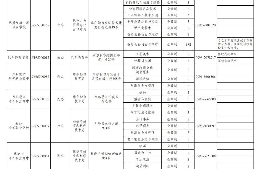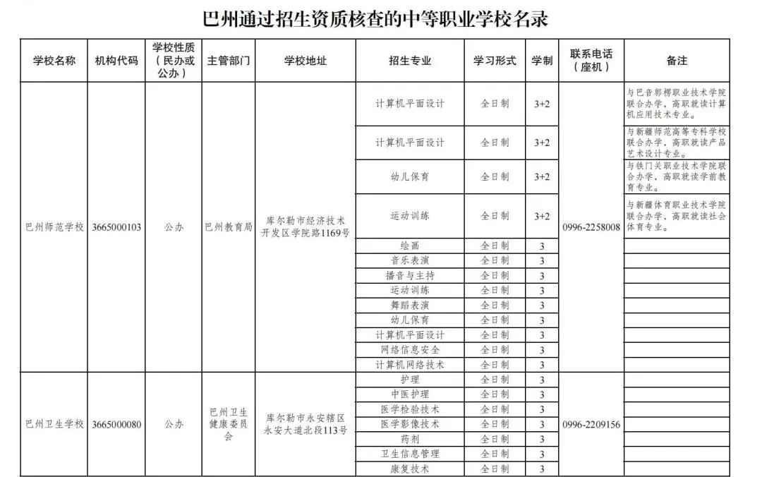 为持续规范巴州中等职业学校招生及办学行为,营造公平、公正、公开的招生秩序与环境,切实维护学校和学生的合法权益,现将2025年具备中等职业学校学历教育招生资质的学校和招生专业公布如下:
