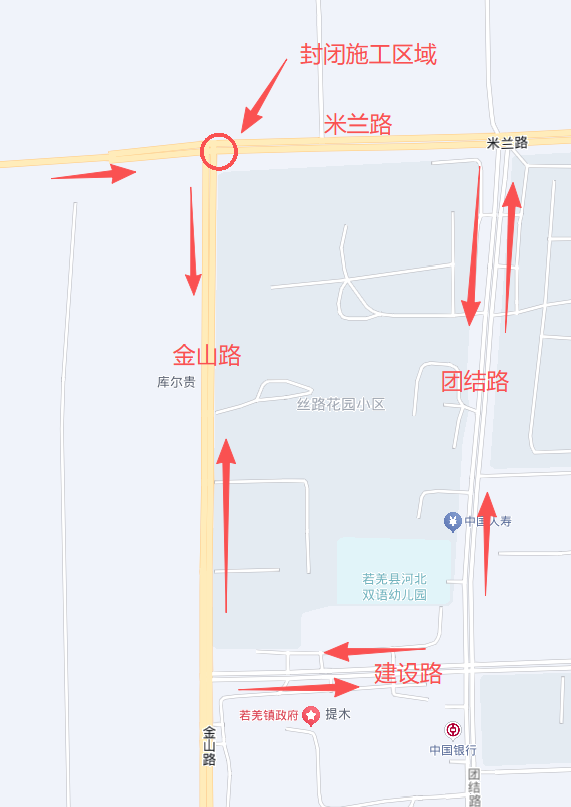 三、绕行路线:途经该路段小型车辆可从建设路绕行;途经该路段大型车辆可从G315国道楼兰大道绕行。