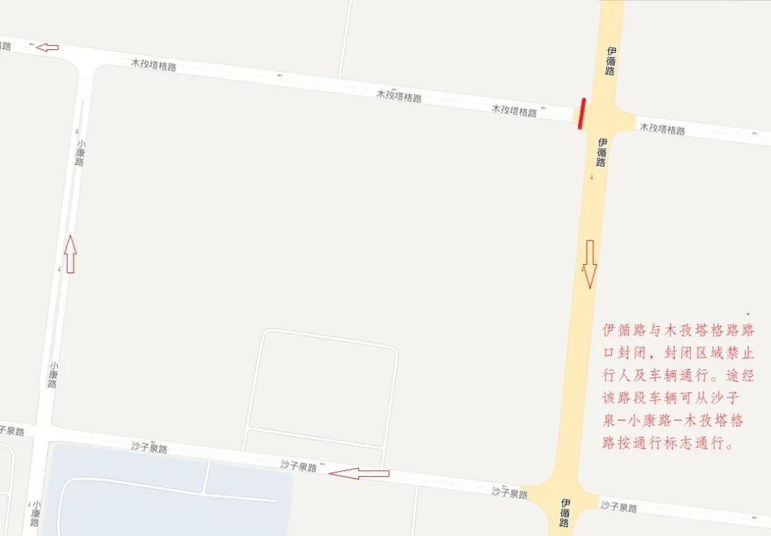 一、封闭路段:伊循路与木孜塔格路路口封闭;