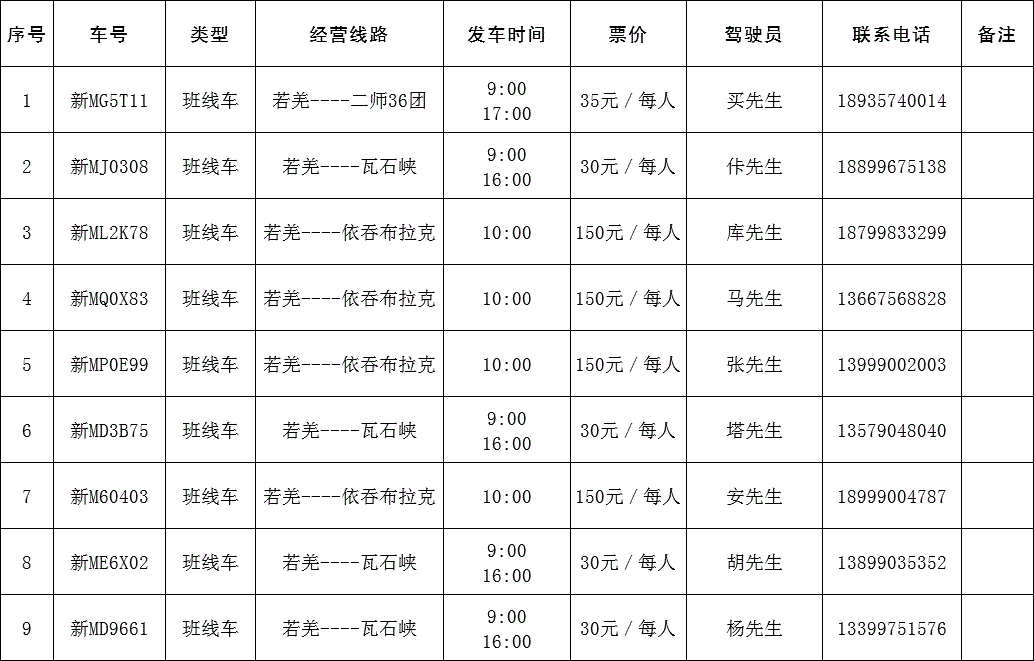 若羌县成渝运输有限公司班线车花名册(县域内)