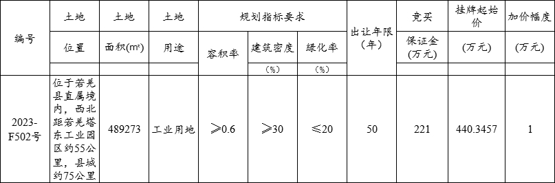 根据《中华人民共和国土地管理法》等法律法规规定,经若羌县人民政府批准,若羌县自然资源局决定以挂牌方式出让1(幅)地块的国有土地使用权。现将有关事项公告如下:
