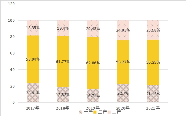 图二:2017年- 2021年三次产业增加值占地区生产总值的比重