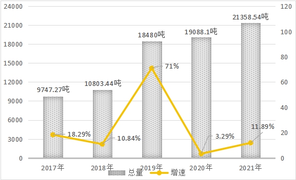 图三: 2017年-2021年粮食作物产量及增长速度