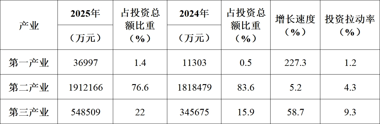 2025年二产完成投资1912166万元,同比增长5.2%,占全县投资比重为76.6%。三产完成投资548509万元,同比增长58.7%,占全县投资比重为22%,拉动全县投资增长9.3个百分点。一产投资虽占比较小,增势突出,完成投资36997万元,同比增长227.3%,占全县投资比重为1.4%,拉动全县投资增长1.2个百分点。