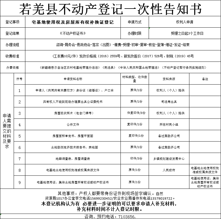 若羌县不动产登记一次性告知书(宅基地使用权及房屋所有权补换证登记)