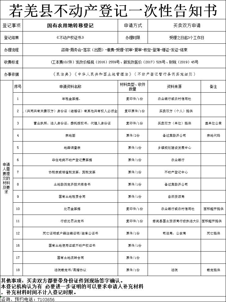 若羌县不动产登记一次性告知书(国有农用地转移登记)