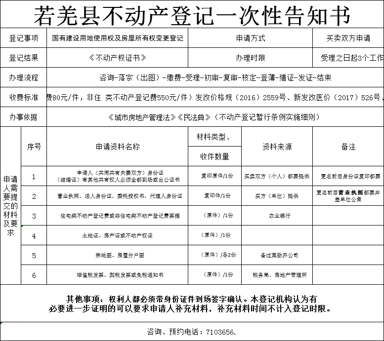若羌县不动产登记一次性告知书(国有建设用地使用权及房屋所有权变更登记)