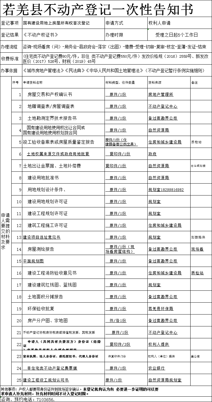 若羌县不动产登记一次性告知书(国有建设用地上房屋所有权首次登记)