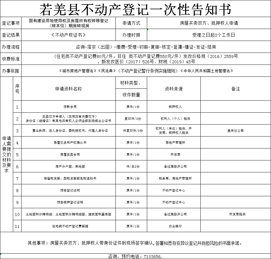 若羌县不动产登记一次性告知书(国有建设用地使用权及房屋所有权转移登记(转本位)期房转现房)