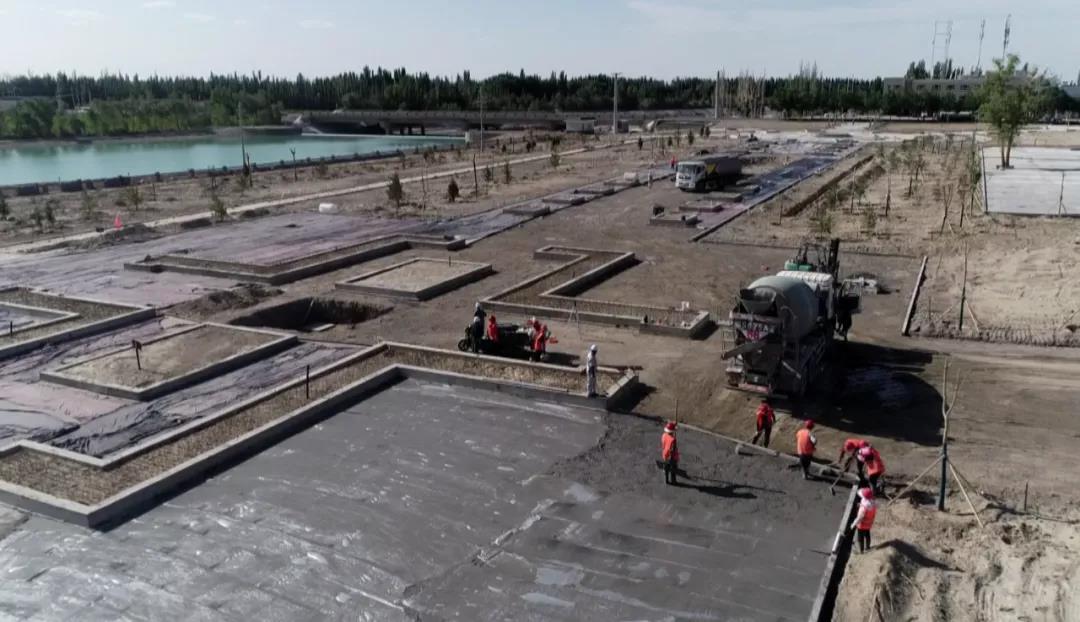 5月27日下午,若羌河西支生态治理(河道两端景观规划)项目施工现场,挖掘机、渣土车等机械正按计划作业,若羌西桥旁河东岸部分施工段已完成景观构筑物建设,工人们正由北往南在园路的路基上浇筑混凝土。