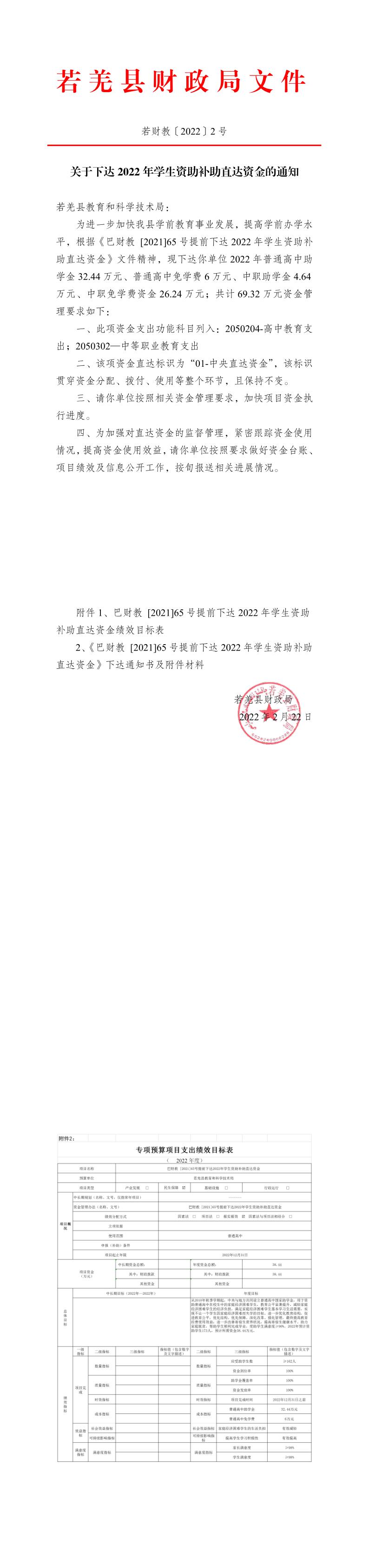提前下达2022年学生资助补助直达资金69.32(高中助学金及免学费)