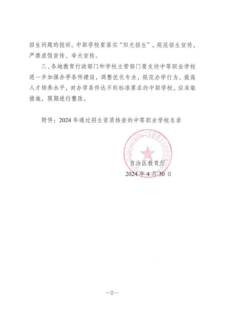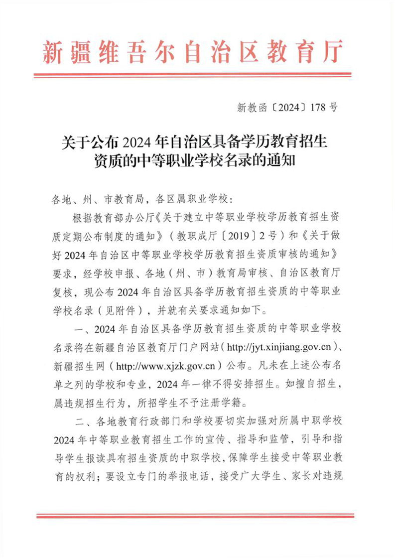 近日,自治区教育厅发布了《关于公布2024年自治区具备学历教育招生资质的中等职业学校名录的通知》(新教函[2024]178号)。