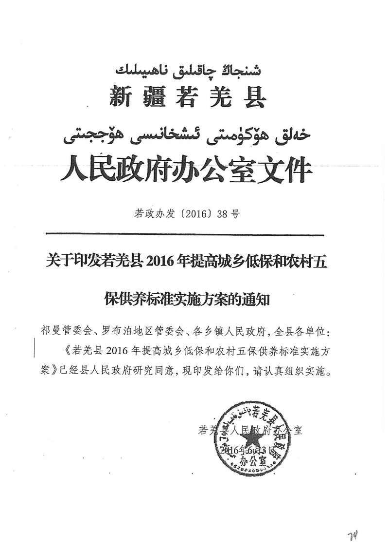 关于印发若羌县2016年提高城乡低保和农村五保供养标准实施方案的通知(若政办发(2016)38号.doc