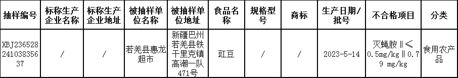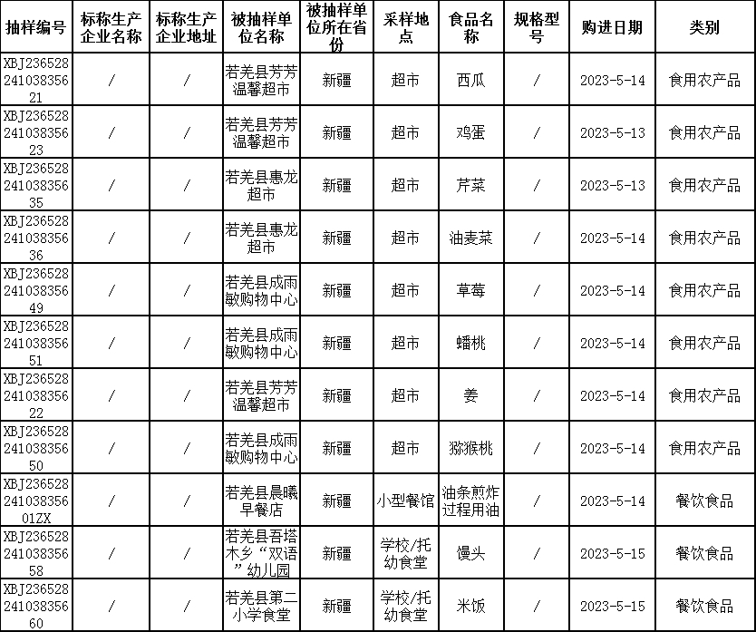 根据《中华人民共和国食品安全法》和《食品安全抽样检验管理办法》的规定,近期,若羌县市场监督管理局对全县范围内经营的12批次食品进行了监督抽检。抽检结果11批次合格,1批次不合格。产品信息详见附件。