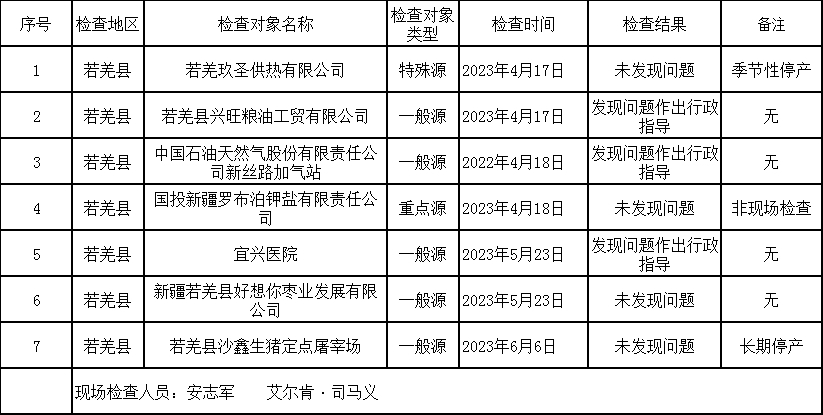2023年4月至6月,巴州生态环境局若羌县分局组织开展若羌县第二季度污染源日常环境监管领域随机抽查检查工作,共抽取一般源7家次,重点源1家次,特殊源对象1家,其他执法事项(建设项目、工业园区)0家次,现将具体信息公开如下: