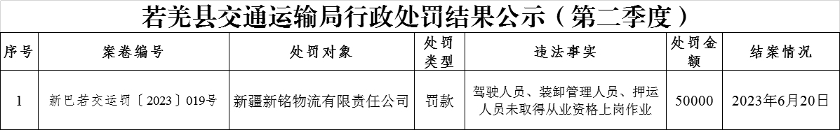 若羌县交通运输局行政处罚结果公示(2023年第二季度)