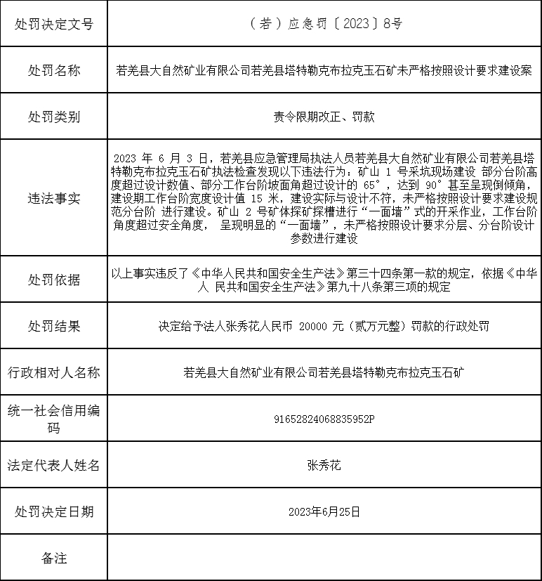 若羌县应急管理局行政处罚公示信息(若)应急罚〔2023〕8号
