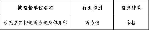 游泳馆共抽检1家,抽检项目为:1.设置卫生管理人员情况;2.建立卫生管理档案情况;3.从业人员健康体检情况;4.设置禁止吸烟标识情况;5.卫生管理制度落实情况;6.水质的日检测情况;7.游泳池水消毒效果监测。