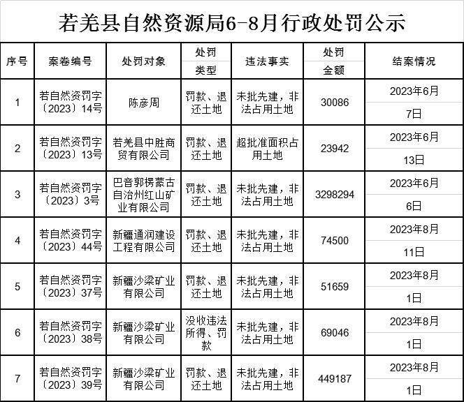 若羌县自然资源局6-8月行政处罚公示