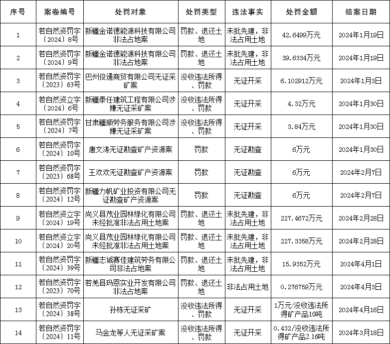 若羌县自然资源局2024年行政处罚案件公示(1月-4月)